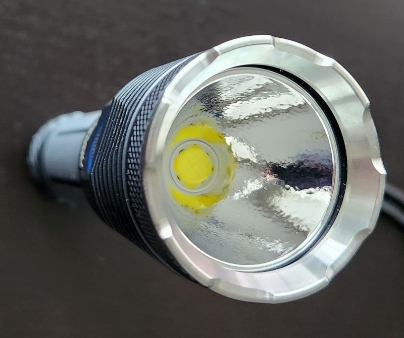 | Decent beam profile with this emitter. However, this build is probably best suited to a smaller die emitter for maximum throw (or the newer XHP70.3 HI option). | Charger on my sample never goes green, (always shows as charging). Max charged battery voltage is only ~4.12V. |