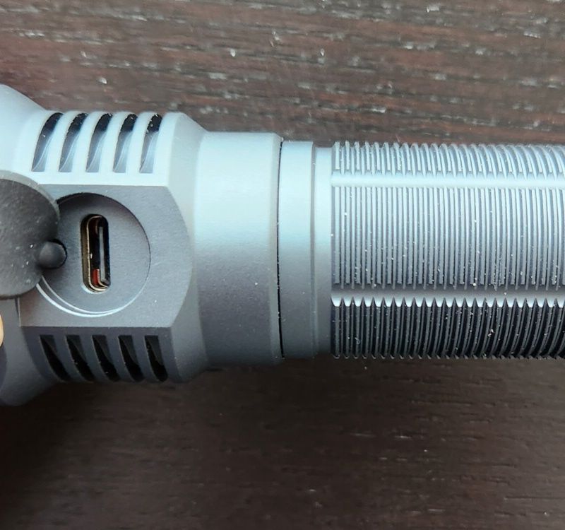 There is an integrated USB-C charging port on the head of the light, across from the switch, under an attached rubber cover. Cover fits well enough to make me think the light is fairly water-resistant.