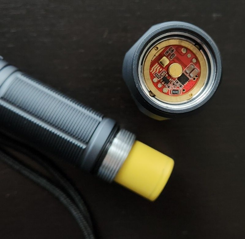 There is a small raised post on the positive contact terminal in the head, so flat top cells can easily be used. Tailcap is flat with a standard spring and retaining ring. Note that like my first S21E sample, the silver-coloured spring included here is fairly stiff, and resulted in some denting of the positive terminal of the battery. I know these springs were replaced with softer gold-coloured ones on later S21E editions.
